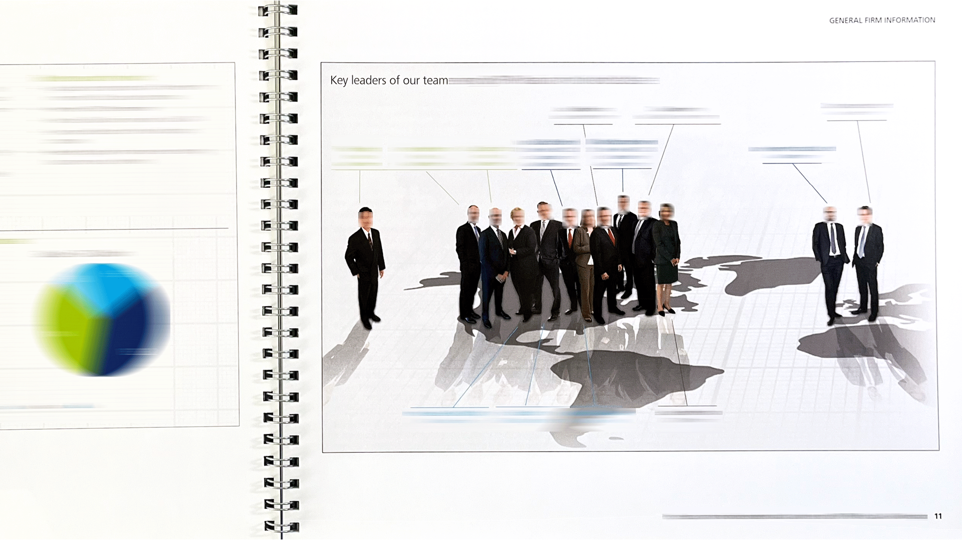 But the bigger innovation was how we showed the global team. I coordinated member firms across multiple countries to photograph their key team members against green screens, then digitally composited them onto a unified service map. Instead of abstract org charts and disconnected headshots, we could show the actual people—faces, names, expertise—positioned exactly where they would serve the client, all on one page. The concept condensed what would have been org charts, maps, and pages of bios into a single strategic image.