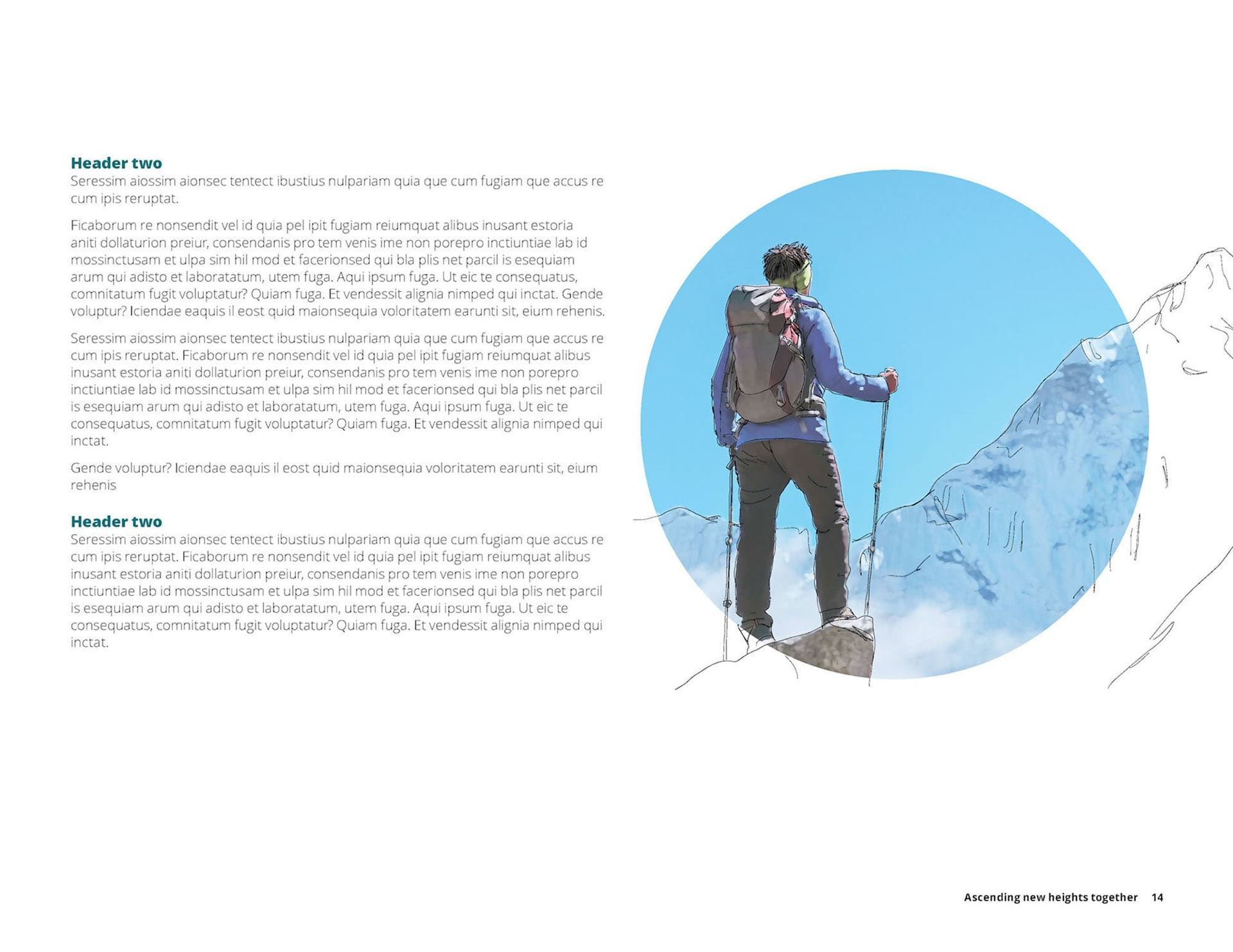 Rather than using stock photography as-is, I developed a custom illustration treatment that transformed it into something entirely proprietary. Working from stock imagery of climbers in extreme terrain, I created hand-drawn illustrations that merged with the photographs — the central image cropped into a circle where photo and illustration blended together, surrounded by pure illustration work that extended beyond the frame.